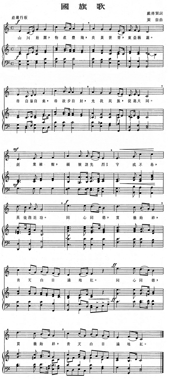 中華國旗破空卓立,裕我民生,土地日闢。 人民相愛,干戈用戢。 大同共登,合世界以為一。 洪惟民國兮,人民共有共治共享。 洪惟民國兮,人民共有共治共享。 据1928年《真光杂志》所载, 戴季陶 在 国民党二届五中全会 (是年8月于南京召开)前夕,于旅途中作国旗歌词。1928年起,戴季陶作词.